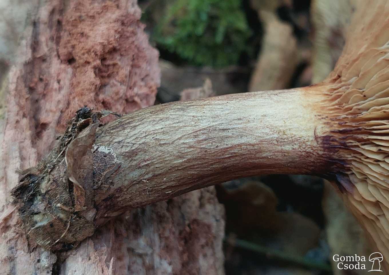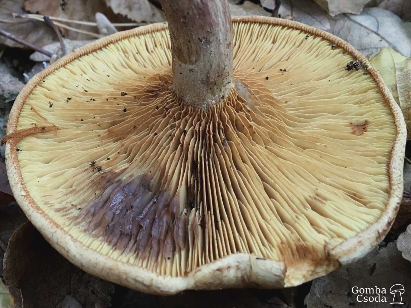Tönkre lefutó, sűrű; szalmasárga, idősen rozsdabarna; nyomásra barnán foltosodó; könnyen lefejthető lemezek.