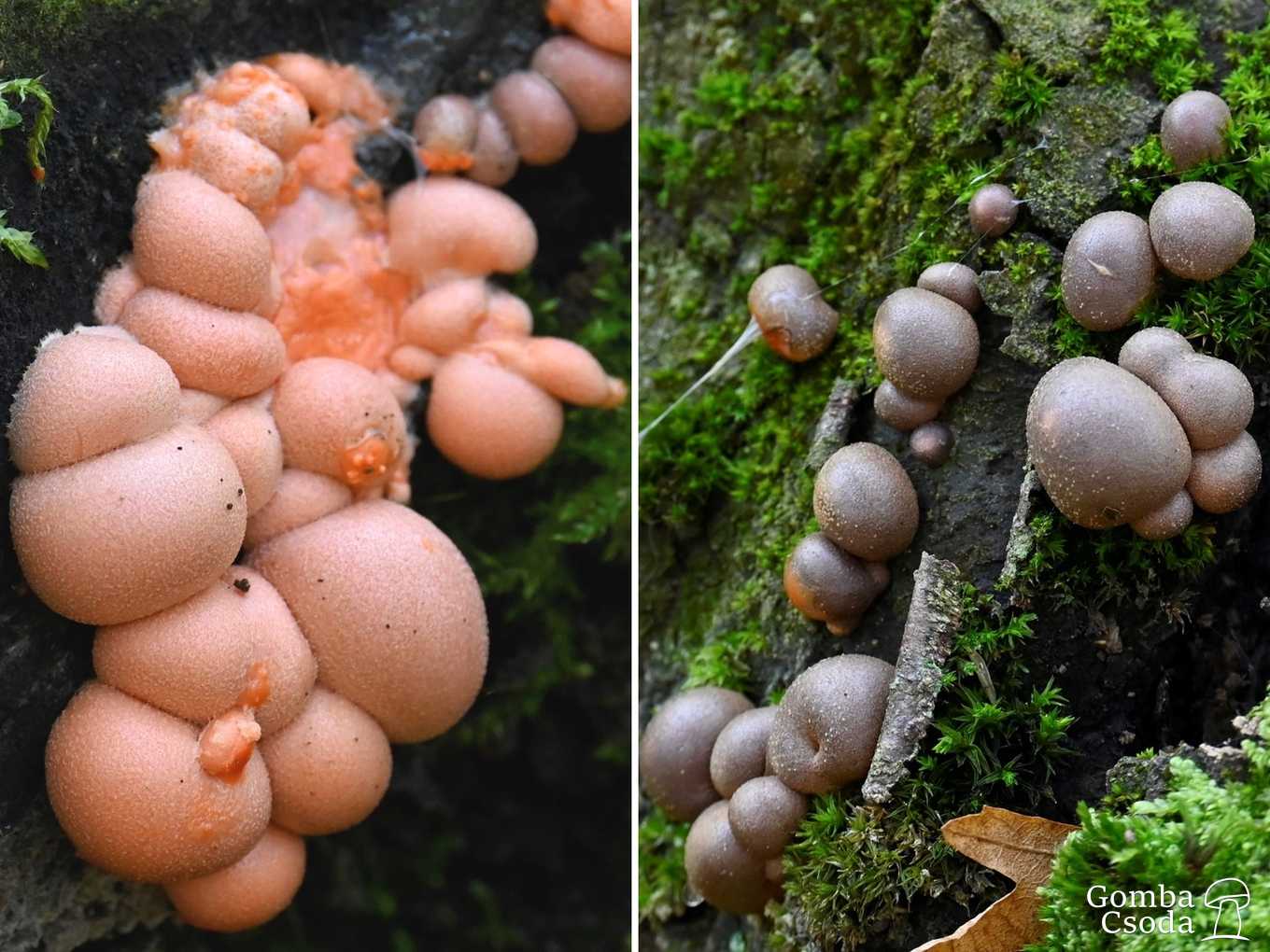 Apró, gömbölyded, finoman szemcsés felületű termőtestei sűrű csoportokban, gyakran egymással kissé összenőve fejlődnek. Fiatalon barackos, rózsás, narancsos, húsvörös színű, lágy állagú, belsejét nyálkás, sűrű, viszkózus folyadék tölti ki, mely a termőtestet finoman összenyomva a felszínre buggyan. Éréskor és kiszáradva fokozatosan szürkés, szürkésbarnás, sötét barnásfeketés színű és egyre szilárdabb lesz, végül a belseje sötétbarna spóratömeggé alakul át. Különböző életszakaszban lévő, különböző színű és állagú termőtesteit sokszor egyszerre is megtalálhatjuk.