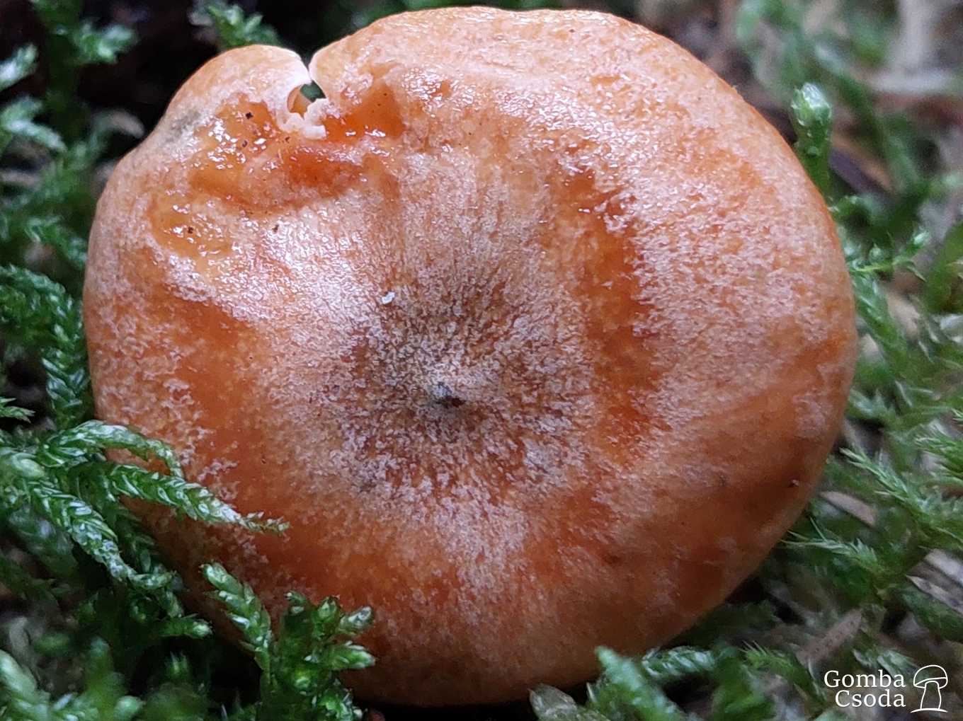 Narancssárgás színű, gyakran zölden foltosodó; sima vagy csak kissé körkörösen zónázott felületű; nedvesen tapadós; fiatalon domború, majd kiterülő, bemélyedő, tölcséresedő, sokáig begöngyölt peremű kalap.