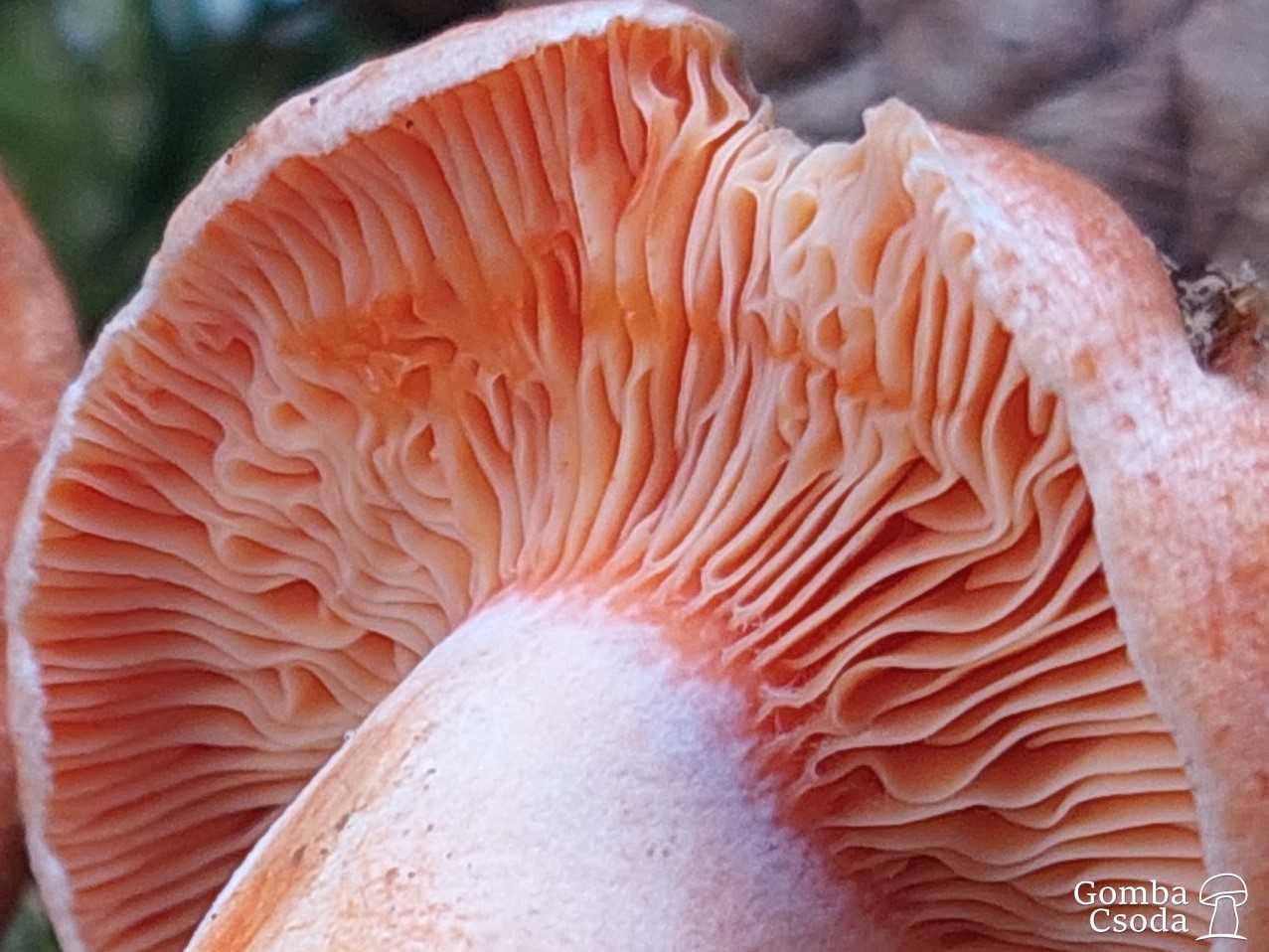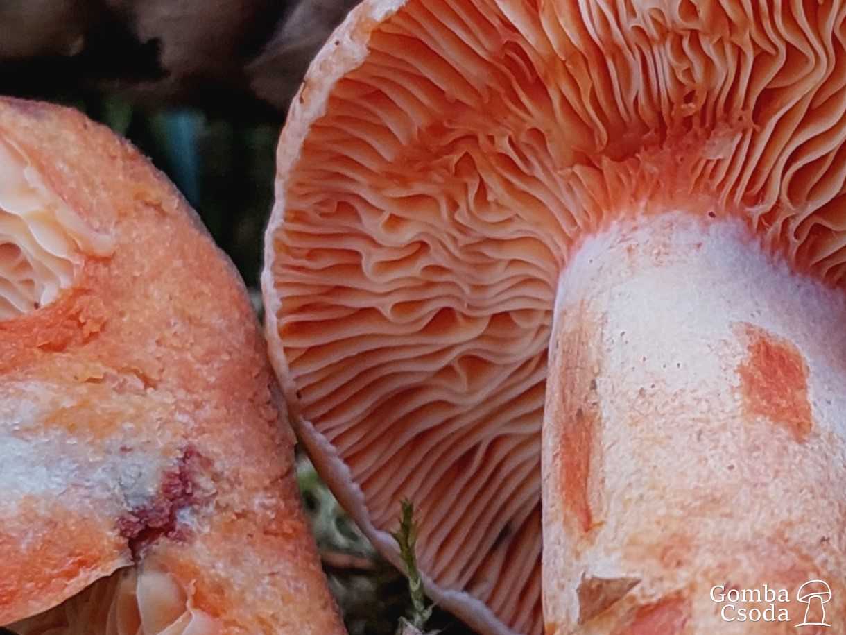 Narancssárga, sérülésre zöldülő; sűrűn álló, kissé lefutó, törékeny lemezek villás elágazásokkal és köztes lemezekkel.