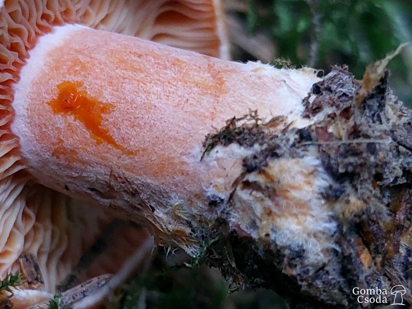 Narancsos színű, a csúcsánál fehéres; sima (nem gödörkés) felületű; hengeres, üregesedő tönk, idővel zöldülhet.