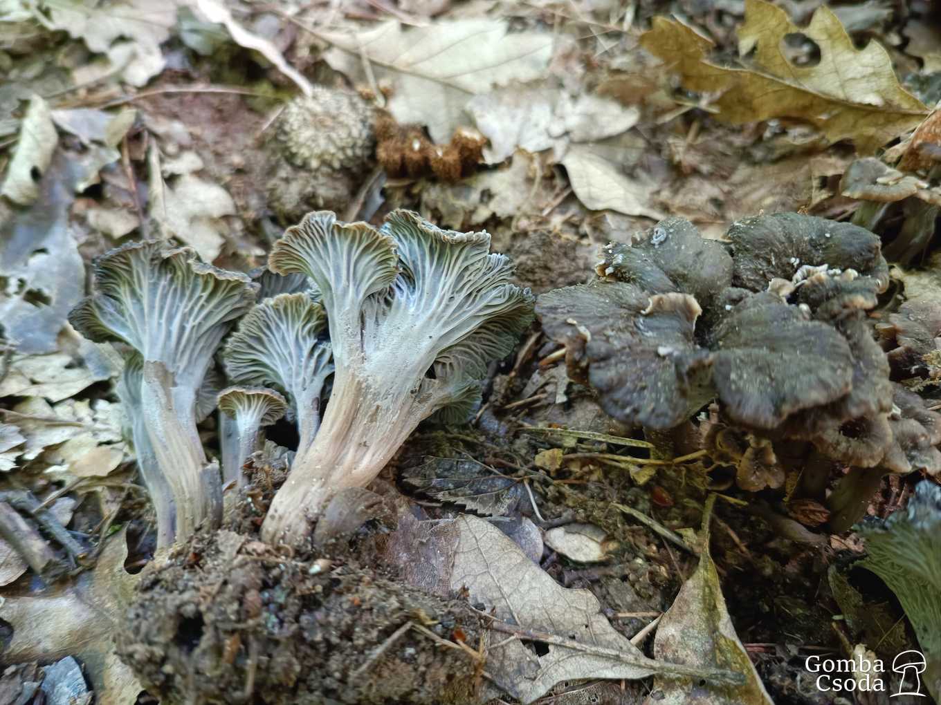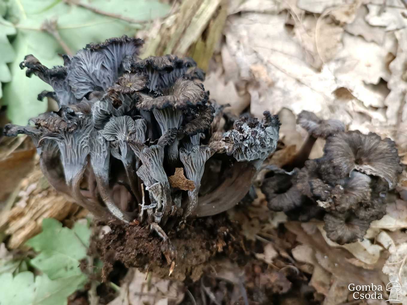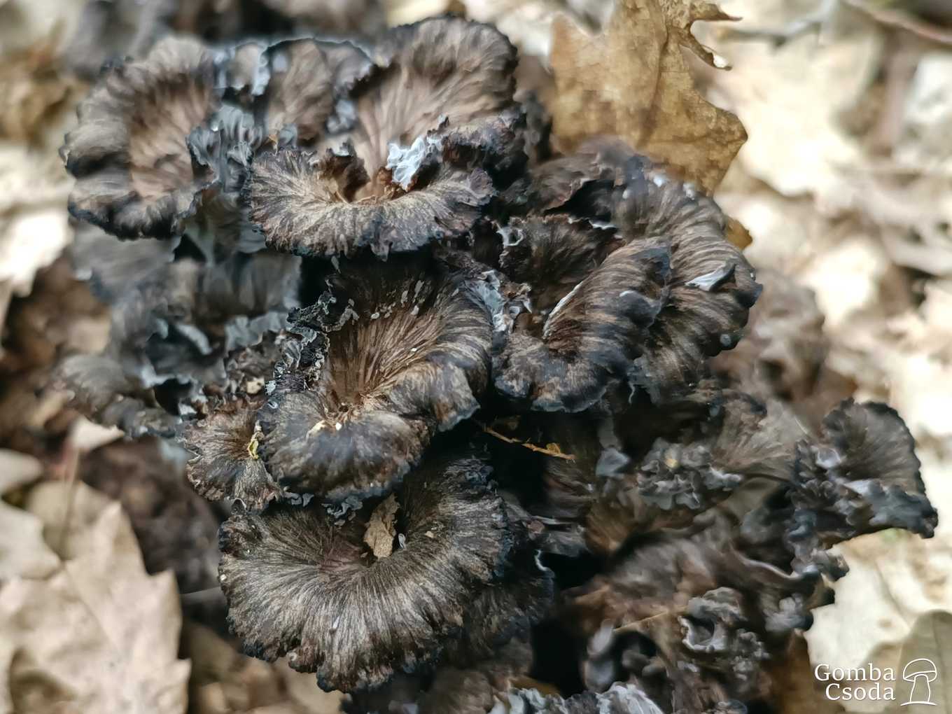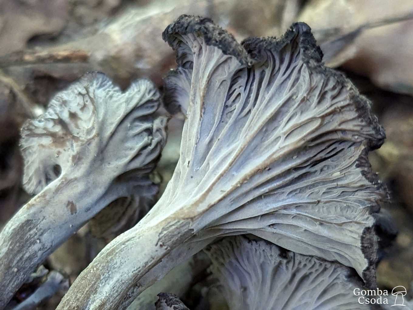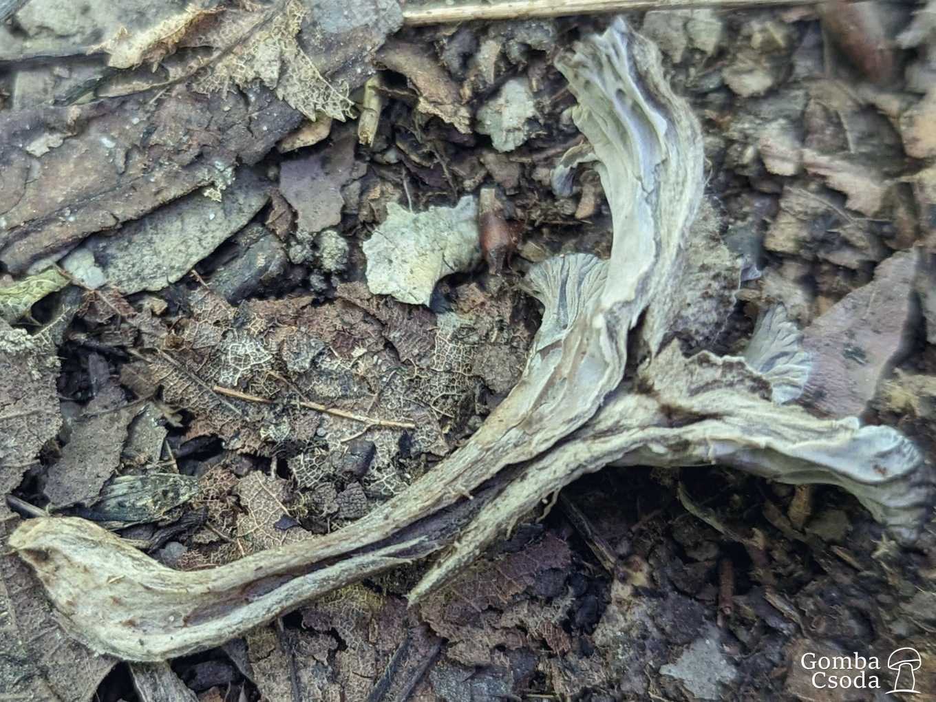 - Szürkés, mélyen tölcséresedő, szabálytalanul hullámosodó szélű kalap